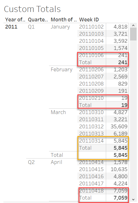 Looking at the above image, you see we’ve successfully fixed some of our totals! There’s still some to go, however. The quarterly total is currently displaying as the sum of our monthly totals…and this makes sense. Remember, our EXCLUDE statement returned data at the level of year-quarter-month, excluding week. When Tableau queries for this total, it is returned 3 numbers (one for each month) and then sums them together. To get our quarterly numbers to compute correctly, we need to add the below into our calculation.