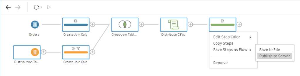 • Create a Tableau Prep flow. This can be as simple as a single file that you want to send as a CSV or it could be a 100-step Prep flow coming from 20 datasources.
